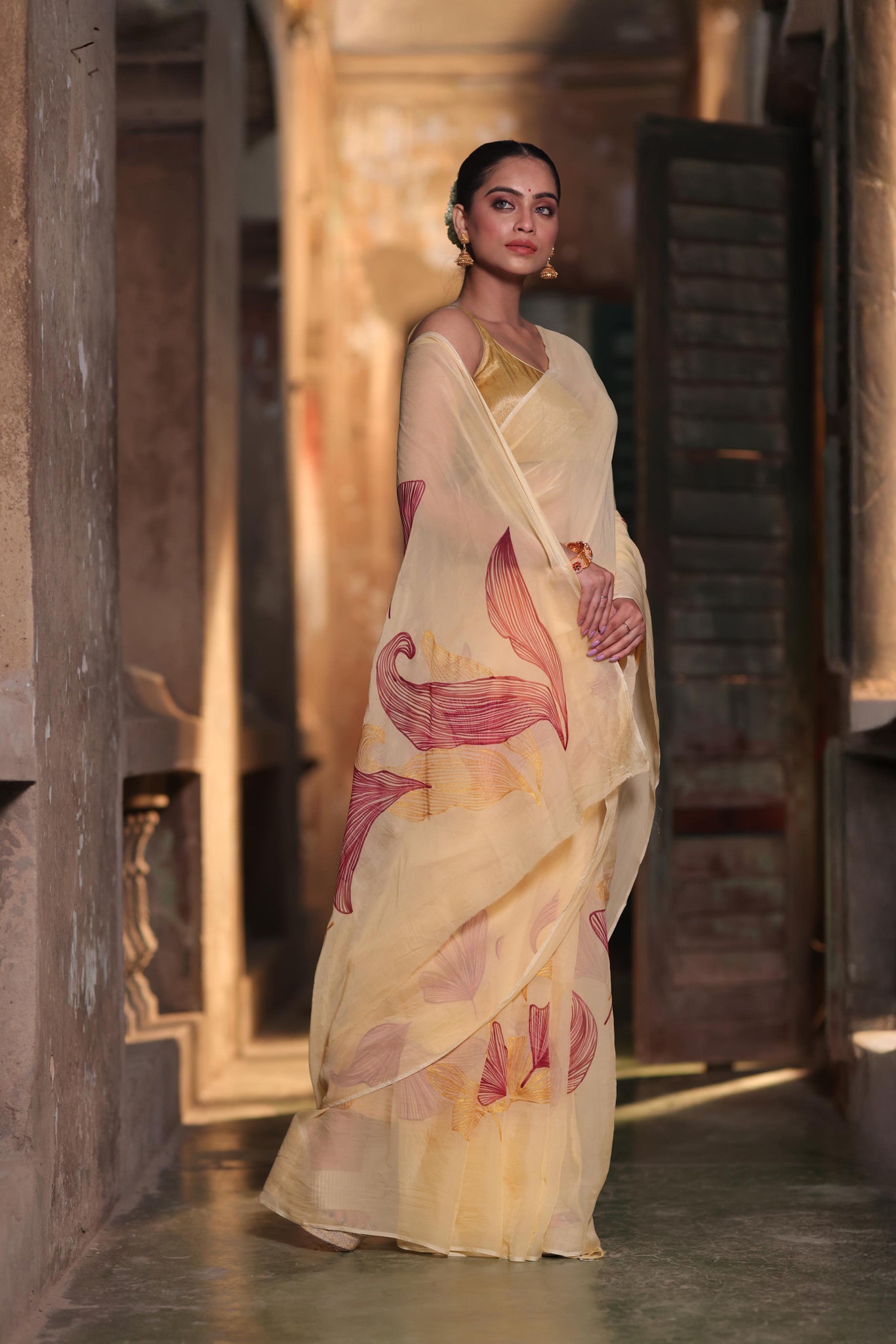 A sheer canvas of pure viscose organza, transformed into a living artwork. Hand-painted with abstract contemporary petals in flight, the saree captures the freedom of nature’s rhythm — a dance between grace and movement. Scattered golden petals glisten like drops of sunlight, adding a divine touch of opulence.